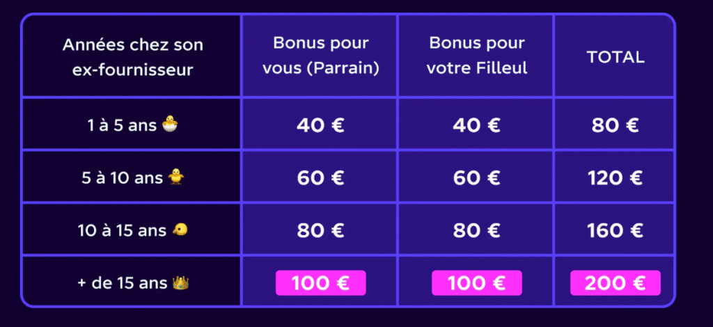 | 🎁 Offre parrainage | 40 € pour le parrain et 40 € pour le filleul à chaque parrainage valide. |